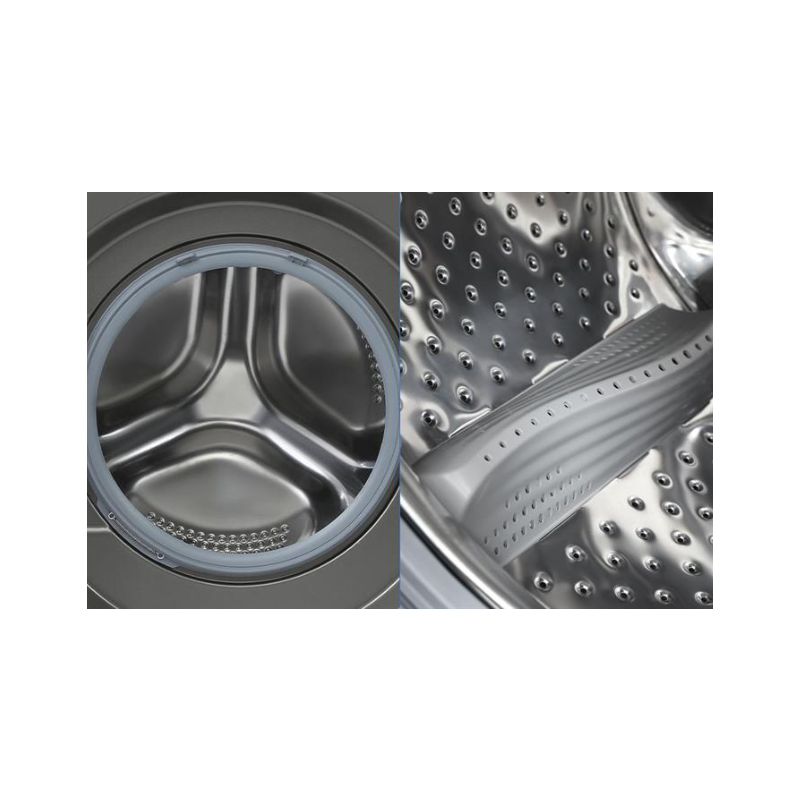 Phần lồng giặt được làm từ thép không gỉ, có khả năng chống ăn mòn, hạn chế cặn bẩn tích tụ. Cửa lồng rộng 50 cm hỗ trợ thao tác bỏ và lấy đồ giặt nhanh chóng, kể cả với các loại đồ cồng kềnh như chăn, mền, áo khoác dày,…