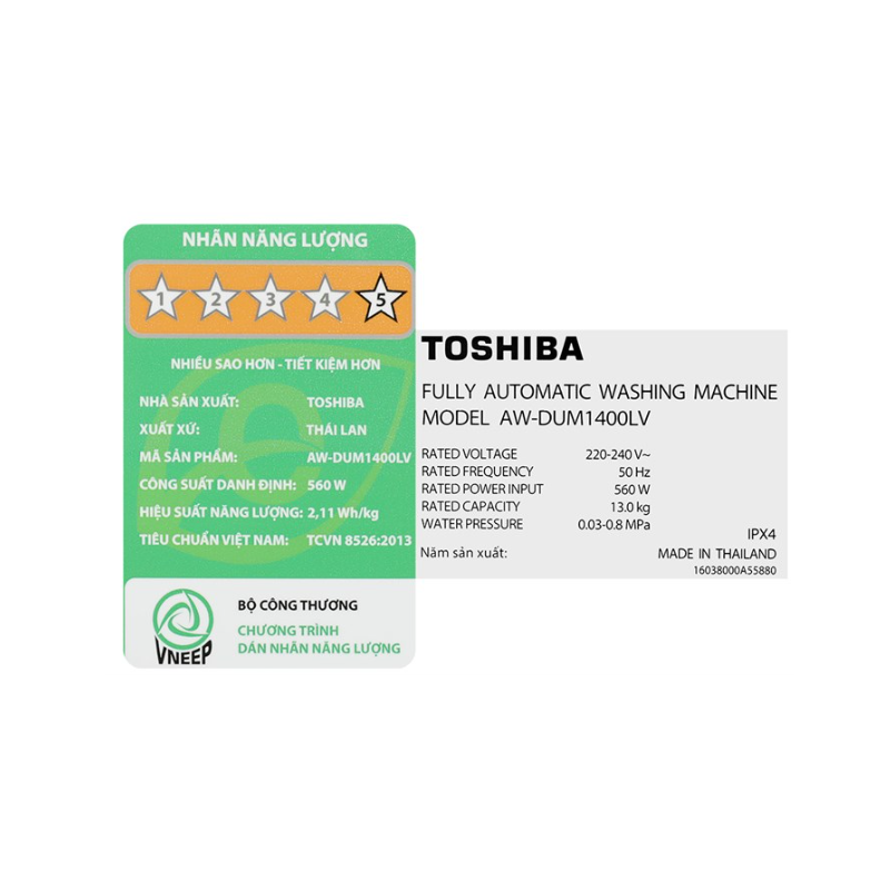 - Máy giặt Toshiba này có khối lượng giặt là 13 kg phù hợp với nhu cầu giặt giũ của gia đình từ 7 thành viên trở lên.