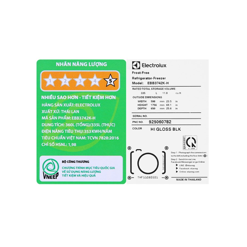 - Dung tích 335 lít, phù hợp cho gia đình từ 3 - 4 người